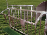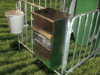 Boxa crestere vitel cu trei locuri, din fibra de sticla, cu varsta de la 2-6 zile. In partea din spate este situata o nisa/geam pentru asigurarea ventilatiei si administrare paie. La cerere se poate livra cu gard din otel galvanizat, din care primul gard de poate demonta usor, trei galeti de adapare, trei suporti pentru supt, iesle, jgheab din fibra de sticla, capace la galeti impotriva ploii.